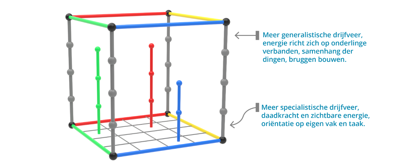 De derde drijfveer betreft de mate waarin energie wordt verkregen van het hanteren van complexiteit: treedt u vraagstukken tegemoet vanuit uw eigen eerdere ervaringen, kennis en kunde met als doel problemen op te lossen? Of gaat u bij voorkeur uit van het perspectief van anderen en van de organisatie, waarbij u een integratieve rol vervult?